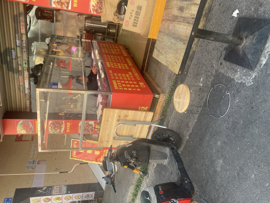 A street-side food stand displays menu items with prices listed in Chinese. The stand is red and has a glass display case with food inside. There's a small wooden stool next to a table. An electric scooter is parked in front of the food stand. The sign mentions prices ranging from 15-35 yuan for various dishes. A phone number is provided for ordering. A box labeled "DL 6828" is on top of the stand.
