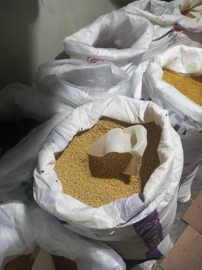 An indoor scene in Laggala, Sri Lanka, depicts a collection of several white woven polypropylene sacks, primarily containing granular material. The most prominent sack in the foreground is open, revealing a substantial quantity of light yellowish-brown, small granular material, likely seeds or grains. A white plastic scoop, featuring a handle, rests partially embedded within this material. Surrounding this central sack are other similar white sacks; one to the immediate right is also open and contains a yellowish granular substance. Further sacks, some appearing empty and collapsed, or partially filled, are visible in the midground and background, against a plain, light-colored wall. Shadows indicate overhead lighting. The floor is dark, and portions of a brown cardboard box or packaging are visible in the lower right section of the image. No individuals are present.