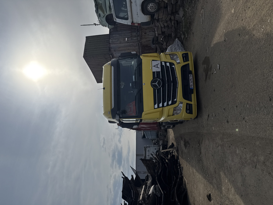 An industrial yard scene, identified as located in Sopot, Bulgaria, is depicted under a partly cloudy sky with a prominent, bright sun in the upper right quadrant. A yellow Mercedes-Benz Actros heavy-duty truck, bearing Bulgarian license plate PB 1695 TH and an "A" decal on its grille, is centrally positioned on an unpaved dirt and gravel surface, facing the viewer. The truck is coupled to a red dump trailer, partially visible behind the cab. A single individual, wearing an orange safety vest, is partially discernible within the truck's driver's cab. To the left, a large pile of dark, contorted metal scrap is present. To the right of the truck, several weathered, dark-colored shipping containers are stacked vertically. Behind these containers, a white cargo van and a significantly damaged light-colored car are visible, resting on a base of stacked rough stones or concrete blocks. A large, grey industrial building is partially visible in the background. Shadows are cast consistent with the sun's position.