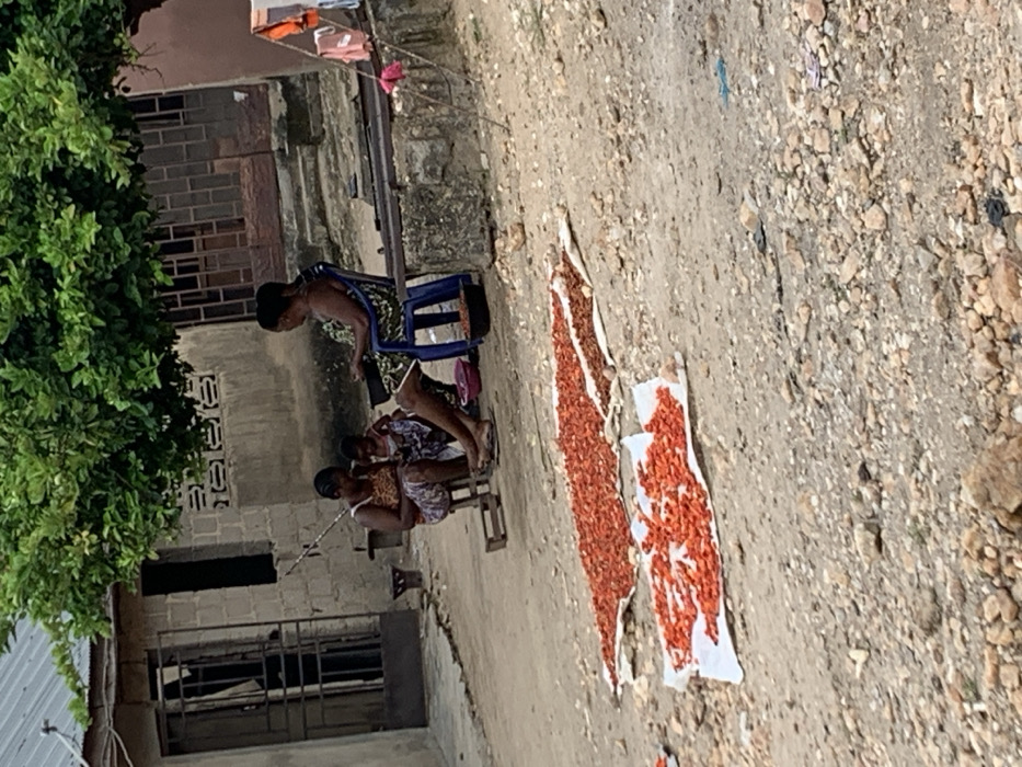 This image captures an outdoor scene in Zango-ndaji, Nigeria, featuring three individuals and materials laid out for drying