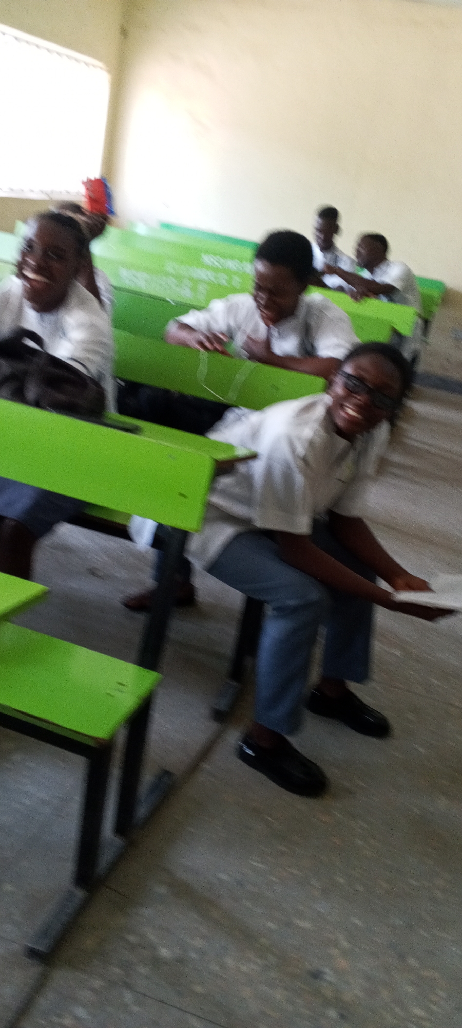 classroom scene in Keffi, Nigeria, featuring several students seated at green desks