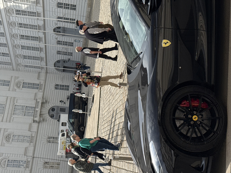 The image depicts a daytime street scene within the Hofburg Palace complex in Vienna, Austria, specifically an area with cobblestone paving and grand, classical architecture. In the foreground, the front left quarter of a black Ferrari 812 Superfast is visible, parked on cobblestones. It features black multi-spoke wheels with red brake calipers and the yellow Ferrari emblem on the fender. In the middle ground, several pedestrians are traversing the cobblestone square. On the left, an elderly woman in a checkered shirt and blue jeans walks with a stick, followed by a person in dark clothing and a woman in a green top and blue jeans. Toward the center-right, a person wearing a straw hat and a colorful patterned jacket takes a photograph with a camera, facing away from the viewer. To their right, three men are walking: one in a white shirt and dark vest, another in a plaid shirt and dark vest, and a third in a light brown jacket and cap. Behind the pedestrians, a dark commercial van and a white trailer-like vehicle are parked near several light-colored bollards. The background is dominated by the multi-story, light-colored stone facade of the Leopold Wing of the Hofburg Palace. The building features numerous tall, arched windows with white frames, ornate balconies, and large arched ground-floor doorways. Several tall flagpoles stand in front of the building. The ground throughout the visible area is paved with cobblestones.