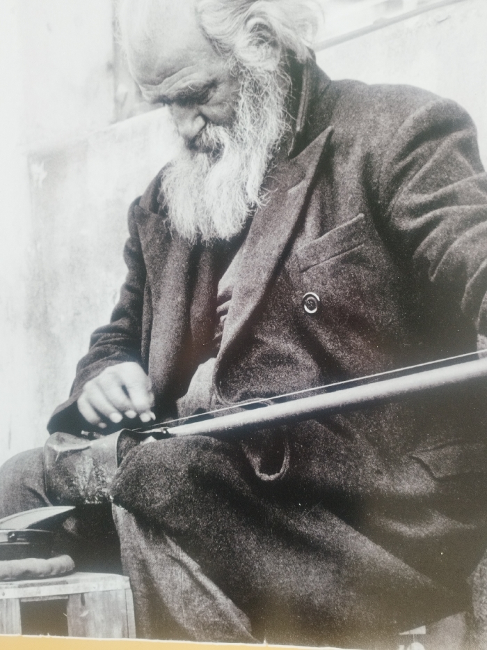 An elderly man with a long, white beard and white hair sits and plays a musical instrument, possibly a stringed instrument. He is wearing a dark, double-breasted coat and is seated on a wooden crate. His head is bowed, focused on his playing. The scene is rendered in black and white, suggesting a photograph taken in the past.