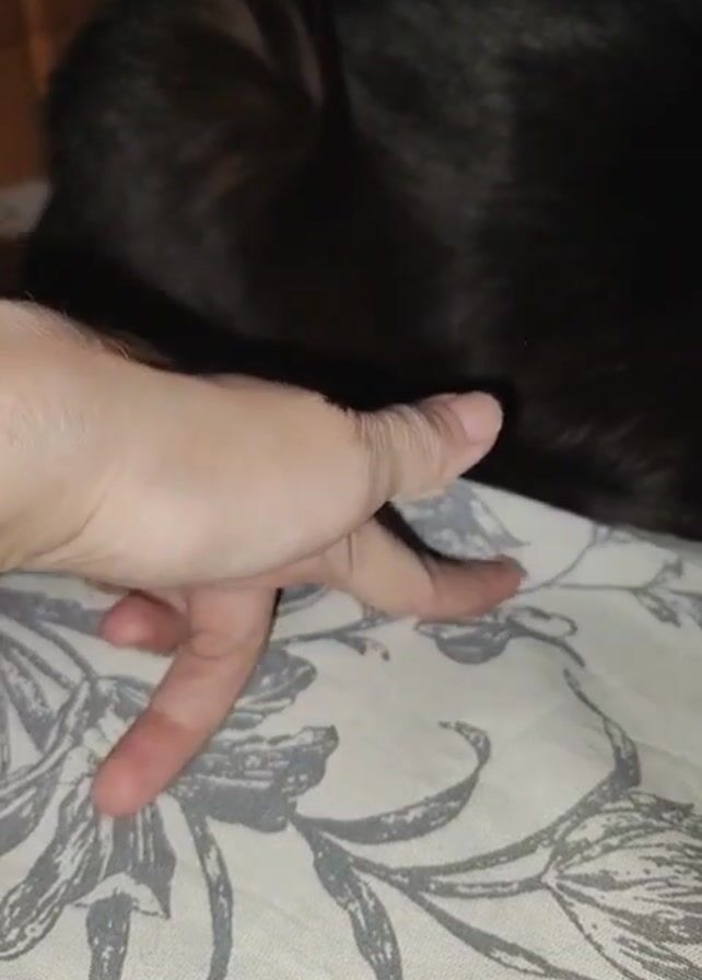 A close-up shot shows a person's hand with fingers splayed out, making small movements on a bed covered with a patterned sheet. The upper part of a dark-colored dog or cat is visible in the background, out of focus. The audio appears to contain a spoken sentence in Russian.