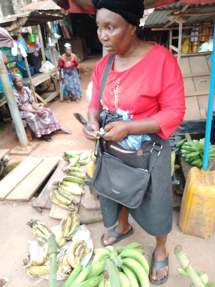 A woman wearing a black head covering, red shirt, and black skirt stands in a market. She holds a small black bag and a knife. A black shoulder bag hangs across her body. Green and yellow plantains are displayed on the ground in front of her, near a yellow plastic container. In the background, two other women are visible, one sitting and the other standing. The market scene has a cluttered and rustic feel.