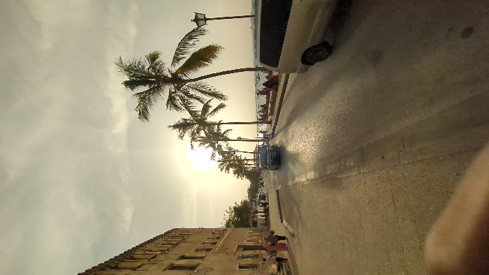 This image depicts a coastal street scene in Stone Town, Zanzibar City, Tanzania, at sunset. The perspective is from a low angle, looking eastward. On the left, a multi-story, weathered building with traditional architecture extends along a pedestrian sidewalk. Two women in long garments are walking away from the camera on this sidewalk, with other indistinct figures further down the street. The asphalt roadway, featuring a centerline, is illuminated by the low sun, creating significant glare on its surface. A dark-colored sedan is driving towards the camera in the middle distance. On the far right, a light-colored van is partially visible, oriented parallel to the road. A row of tall palm trees lines the right side of the road, silhouetted against the bright sky and ocean. Behind the palm trees, a public area with numerous people is visible, many seated or standing, facing the Indian Ocean. The sun is low on the horizon over the water, casting long shadows and creating a strong lens flare effect. Several boats are discernible on the water in the background. A traditional street lamp stands prominently near the right edge of the frame, behind the van. A blurry object, likely a finger, partially obstructs the lower-left foreground.