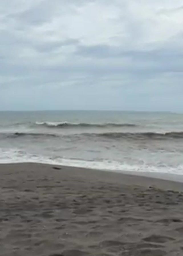 dark sandy beach under a cloudy sky. The waves are rough and choppy, crashing against the shore with white foam. The water appears a murky grey-brown. A portion of what appears to be a wooden structure is visible in the foreground on the right side of the frame. The scene is static with no apparent people visible.