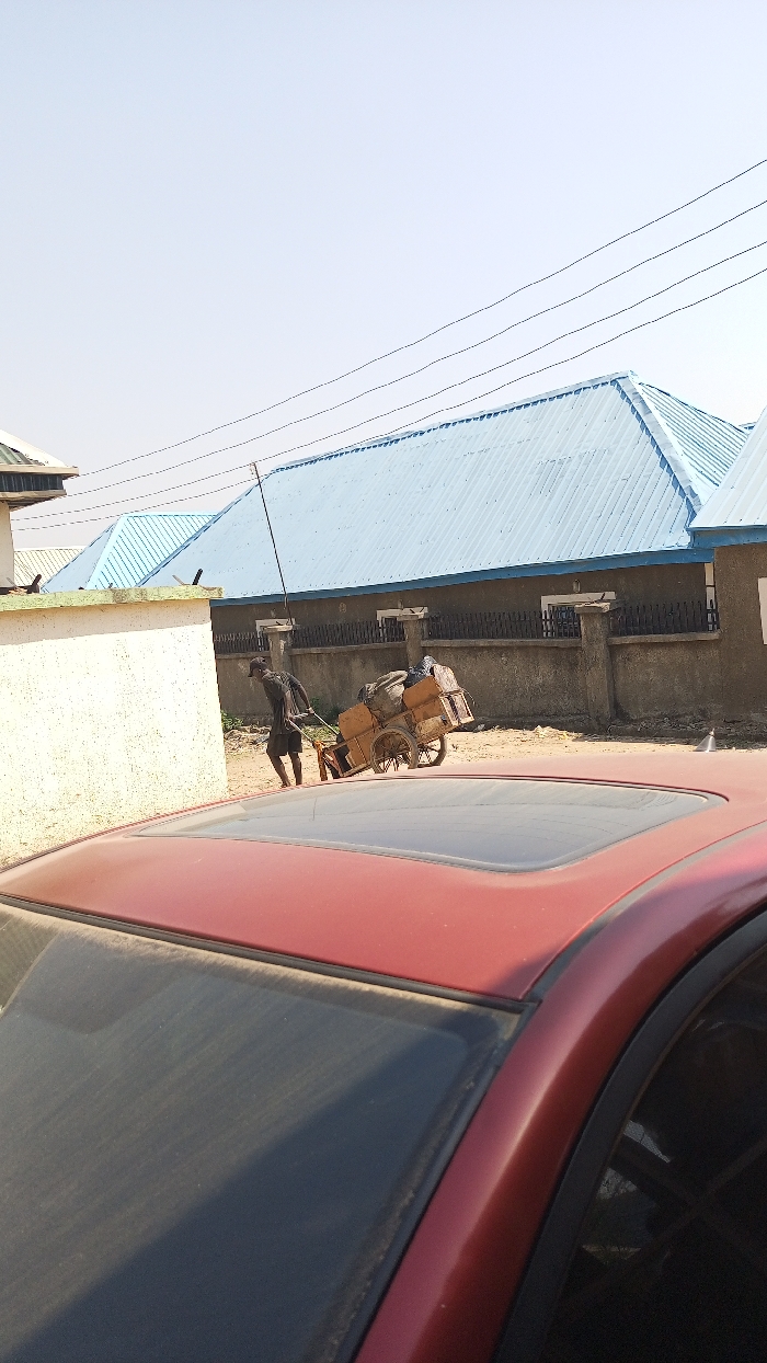 The scene depicts an outdoor urban or semi-urban environment in the city of Unknown, Unknown, under clear daylight conditions. In the immediate foreground, the dusty, dark red roof and windshield of a vehicle, featuring a dark-tinted sunroof, are visible. Beyond this, a light-colored concrete wall partially obstructs the view. In the mid-ground, a lone individual, appearing male and dressed in dark clothing, is actively pushing a two-wheeled wooden handcart. The handcart is laden with cargo, including several light-colored, rectangular boxes or crates, and darker bundled items secured on top. The ground beneath the cart is unpaved, dusty, and uneven. The background features several structures, including buildings with light blue corrugated metal roofs and muted-colored walls. A dark-colored fence or decorative trim runs horizontally along the lower portion of one building's wall. Overhead, multiple utility lines span the scene against a clear, bright sky. A tall, thin pole-like structure is visible near the individual and cart.