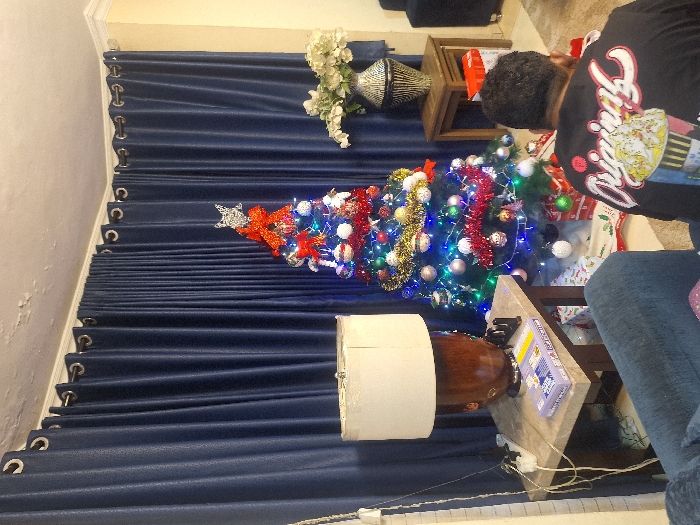 - "A Christmas tree stands decorated with lights and ornaments in a room with long, dark blue curtains" by FM-JQPEg2, licensed under CC BY 4.0