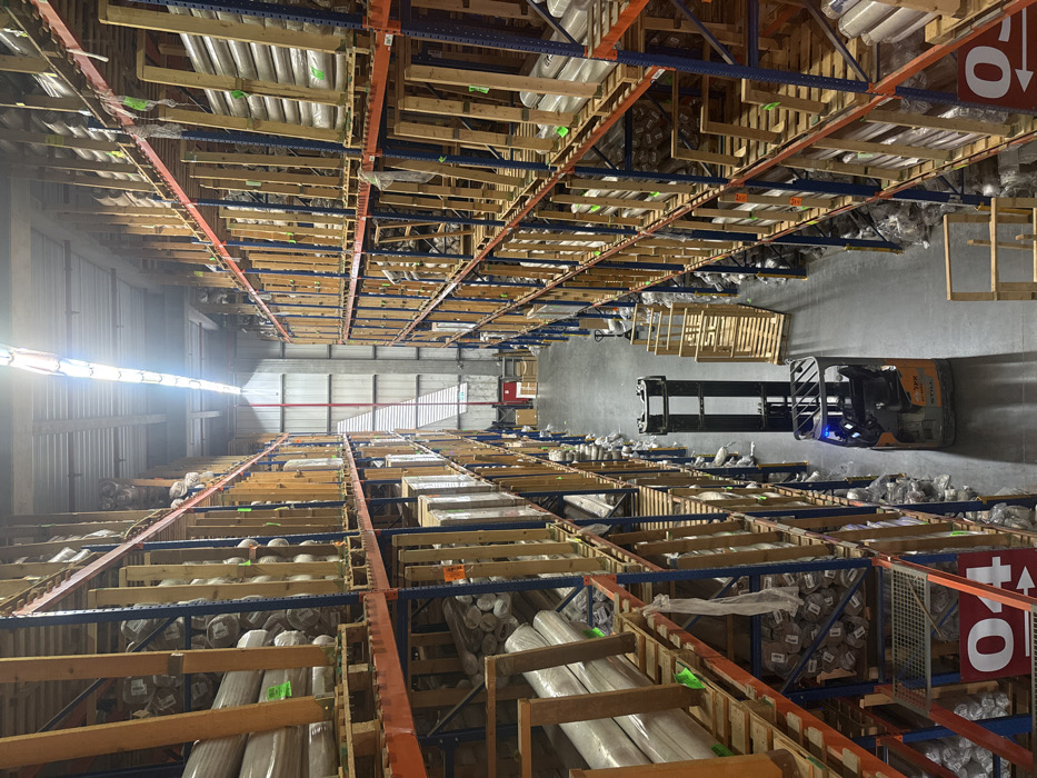 The image displays the interior of a large industrial warehouse located in קריית שדה התעופה, Israel. The scene is captured from an elevated perspective, looking down a long, narrow aisle flanked by two expansive, multi-level storage racking systems. The storage racks feature orange horizontal beams and blue vertical supports, extending into the background. Each level of the racks is occupied by numerous wooden pallets, predominantly laden with rolls of material, likely textiles or fabric, individually wrapped in clear plastic. Some cardboard boxes are also visible on various shelves. In the central gray concrete aisle, approximately midway into the depth of the image, a gray and orange stand-up forklift (reach truck), branded "STILL," is present. The forklift's mast is upright, and a blue safety light is visible on its cabin. Several empty wooden pallets are positioned on the aisle floor near the forklift. Further down the aisle on the right, a manual pallet jack is discernible. Overhead, a prominent, long, bright LED or fluorescent light fixture extends along the corrugated metal ceiling, providing illumination for the aisle. The far end of the aisle shows industrial walls, possibly corrugated metal, with red structural elements and a ground-level opening. In the bottom-left foreground, a red and white sign on the lowest shelf displays "O4" with a right-pointing arrow. No individuals are visible in the scene, and no overt actions or interactions are depicted.