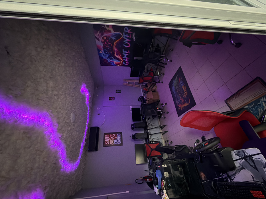 The image displays the interior of an unoccupied gaming room located in Devnya, Bulgaria. The room features light grey walls and a textured, light-colored ceiling illuminated by a wavy pattern of purple LED strip lights. The floor consists of light-colored tiles, and a black rug with a colorful "GAMER" graphic occupies the central area. On the left wall, a black, wall-mounted air conditioning unit is positioned below the ceiling. Beneath it, a framed poster reads "SHHH! I'M GAMING" with an accompanying graphic of a hand holding a gaming controller. A red fire extinguisher is visible mounted on the lower section of the left wall. Multiple gaming stations are arranged throughout the room, each featuring a dark desk, a computer monitor, and a rolling gaming chair, primarily in red and black upholstery. One station in the foreground on the left includes a black racing wheel peripheral and pedals. On the far wall, a large banner depicts a stylized gaming controller with neon accents and the text "GAME OVER." To the right of the banner, a wooden folding ladder leans against the wall, adjacent to a cardboard box on the floor. Smaller framed items are present on the mid-left wall. The room is devoid of people. The image is framed by a white door jamb on the right side.