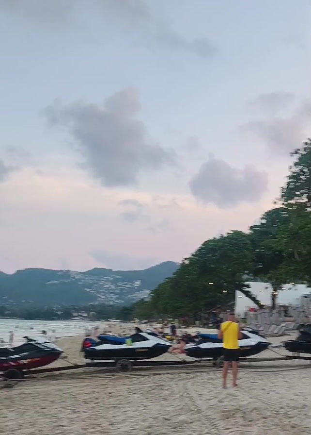 beach scene under a cloudy sky. Initially, the focus is on the sandy beach with tire tracks, a man in a yellow shirt, a tractor, trees, and several jet skis on trailers. As the camera pans, it reveals more jet skis on trailers along the shoreline. People can be seen in the water, some near the jet skis, appearing to be getting ready or just having finished riding them. In the background, there's a view of mountains across the water.