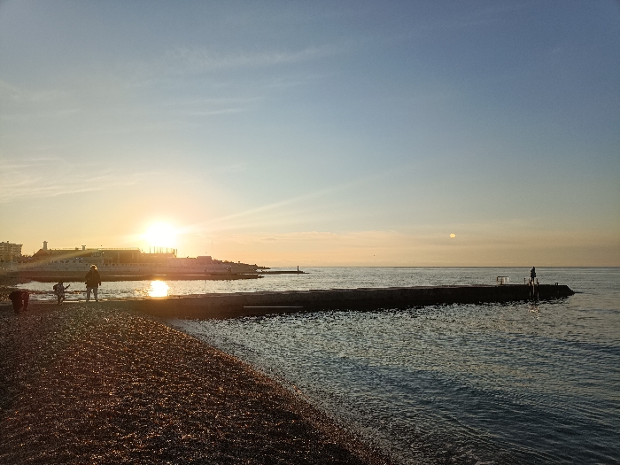 A sunlit beachscape features a rocky shore in the foreground, transitioning to a calm, reflective sea. A concrete pier extends into the water, with a lone figure standing at its end. In the distance, a building complex is silhouetted against the bright, setting sun. The sky above is a gradient of blue and orange, indicating either sunrise or sunset.