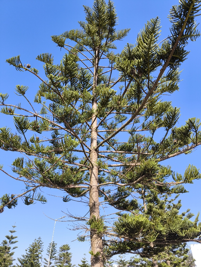 - "A tall, slender evergreen tree, identified as a Norfolk Island Pine (Araucaria heterophylla), dominates the central frame against a clear, uniform blue sky" by FM-jgNAL2, licensed under CC BY 4.0
