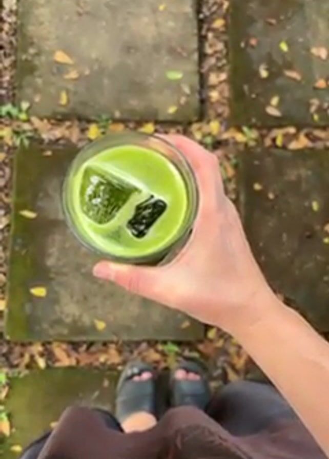 A person holds a glass of green liquid with dark ice cubes, standing on a stone path surrounded by grass and fallen leaves