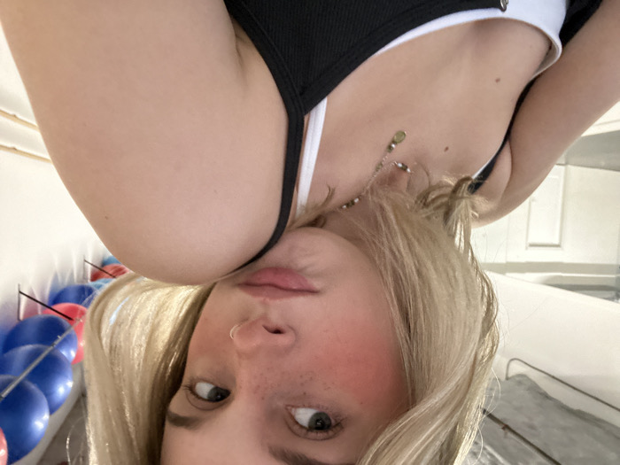 A blonde woman looks downward into the camera, her face close to the lens. She has fair skin, freckles, and a nose ring. She wears a black and white tank top, and a delicate necklace. Blue and red balloons are visible in the background, along with a white wall and some household items. The image appears to have been taken from an upside-down perspective.