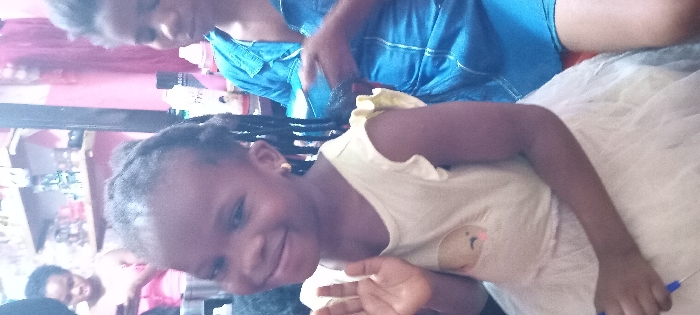 A young girl in a white tulle dress and light-colored top smiles at the camera, holding out her hand. Her hair is styled in braids. A person in a blue shirt braids her hair. In the background, another individual smiles at the camera. Various products sit on a shelf behind them. The scene appears to be a salon or similar setting where hair styling occurs.