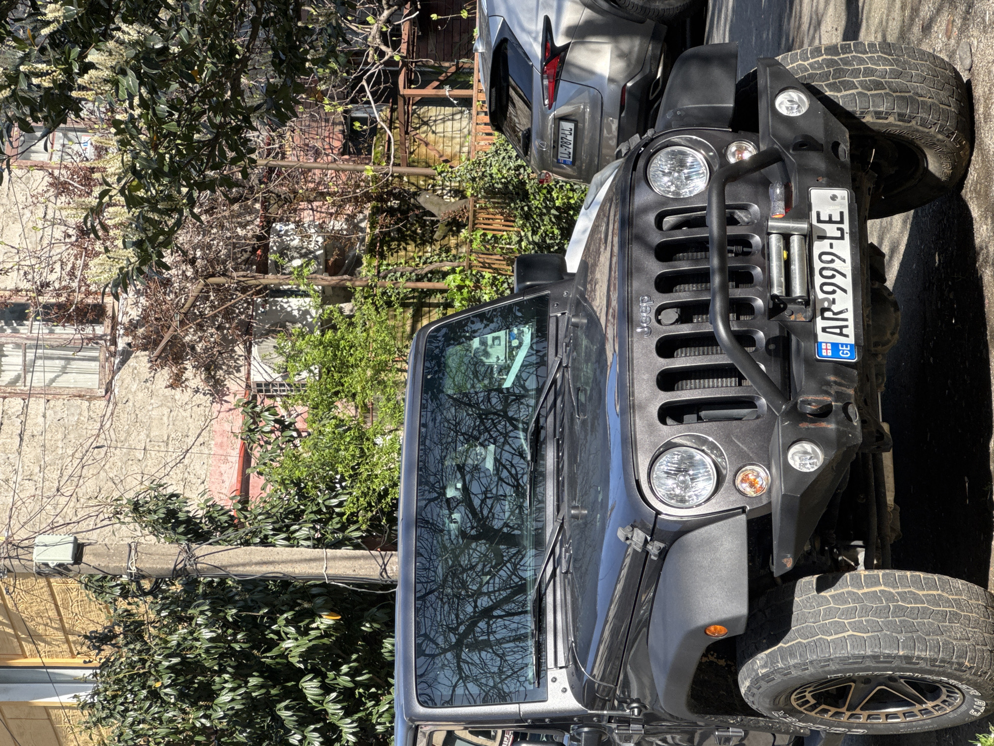 gray Jeep Wrangler parked on a street in what appears to be a residential area. The license plate of the Jeep reads "AR-999-LE" and has the Georgian flag on it. Another gray car is parked behind the Jeep, and part of its license plate "LL-787-LL" is visible. In the background, there is a fence with greenery behind it, as well as a building or house with some vegetation around it. A utility pole with wires is visible on the left side of the frame. The photo appears to have been taken during the day, with bright sunlight.