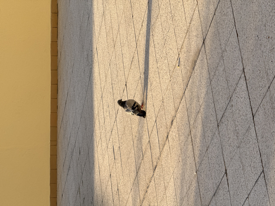 This image depicts an exterior paved area in Vila Nova de Gaia, Portugal, under direct sunlight. A single rock pigeon (Columba livia) stands slightly left of center on the light-colored, square-tiled pavement. The pigeon is oriented facing left, with its head turned partially towards the right, displaying grey, white, and iridescent neck plumage, and reddish-orange feet. Strong shadows are cast to the right of the pigeon and from an unseen structure, creating a distinct horizontal shadow line across the ground. The background consists of a plain yellow wall, below which is a brown-orange tiled baseboard or curb. A small, dark, elongated object, consistent with a cigarette butt, is visible on the pavement in the lower right quadrant. No other subjects or interactions are present.