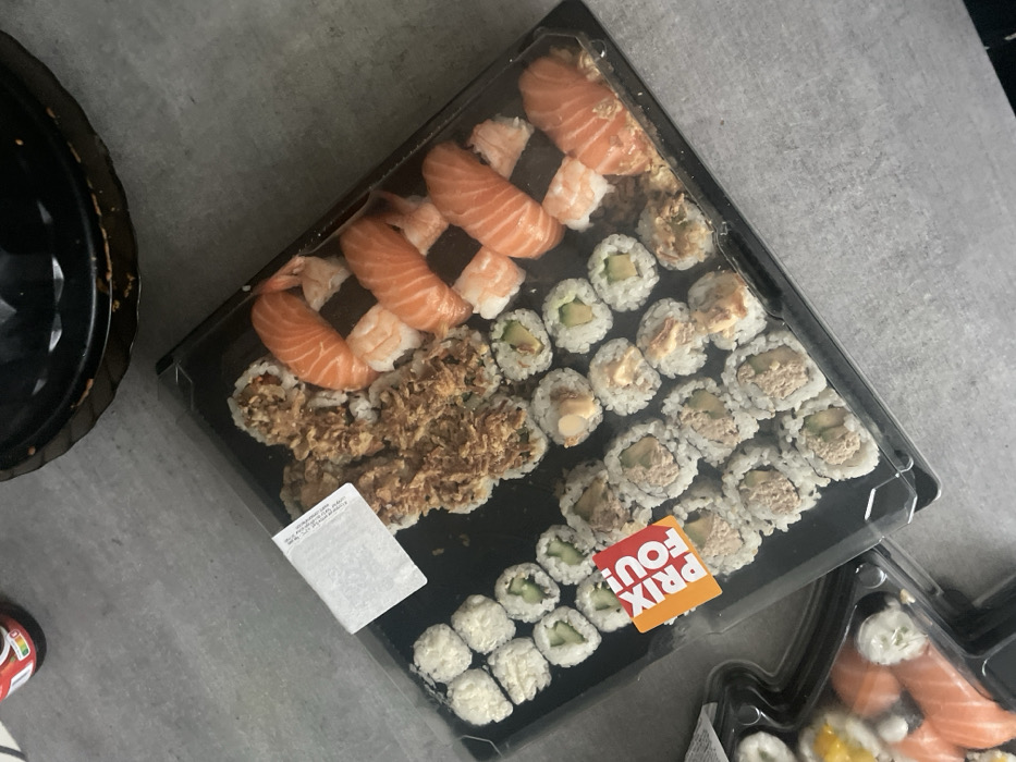 - "A rectangular clear plastic container with a black base, filled with various sushi and maki rolls, is centrally positioned on a grey, textured surface" by FM-Tmicy2, licensed under CC BY 4.0