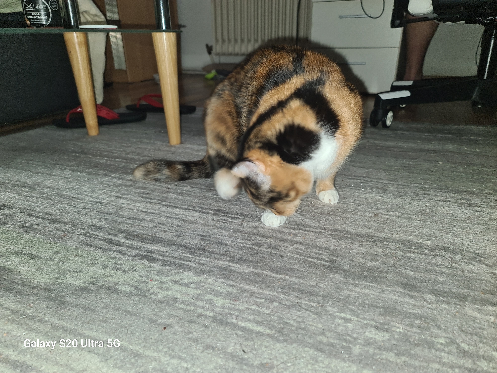 An indoor scene in Budenheim, Germany, depicts a calico cat on a grey, textured carpet