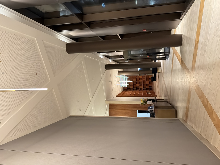 A contemporary building interior presents a view down a hallway. Overhead, dark, cylindrical structures traverse the space, aligning with a complex grid system. The ceiling is a geometric pattern of white panels, and the floor is tiled with beige and tan accents. In the distance, a wooden bookshelf and a reception desk can be seen, illuminated by a modern chandelier.