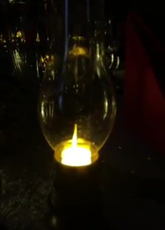 small, clear glass lantern with a tea light candle inside. The lantern sits on a dark surface that may be a table. Other glasses and a red napkin are visible in the background, suggesting a dinner setting. The candle flame is lit, providing the only light source. The scene appears to be dimly lit.