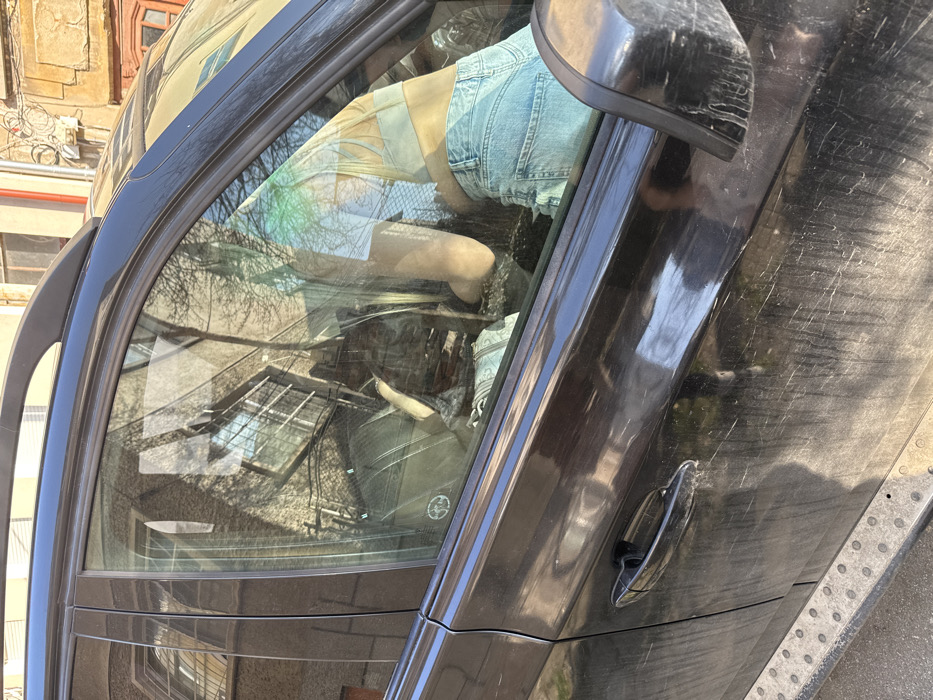A dark-colored, visibly dirty SUV is parked outdoors on a bright day in Sofia, Bulgaria. The front passenger window reflects an old, light-colored building with multiple rectangular windows, some fitted with metal security grilles, and bare tree branches, along with patches of blue sky. Inside the vehicle, a young adult female is seated in the front passenger seat. She has long, light-colored hair and is wearing a light-colored cropped top and light blue denim shorts or jeans. Her right arm is bent at the elbow, and her hand is positioned near the vehicle's center console or dashboard area. A light blue, patterned bag or fabric is visible on the passenger seat or floor. The vehicle's exterior shows streaks of grime and dust, particularly on the lower door panel and running board.