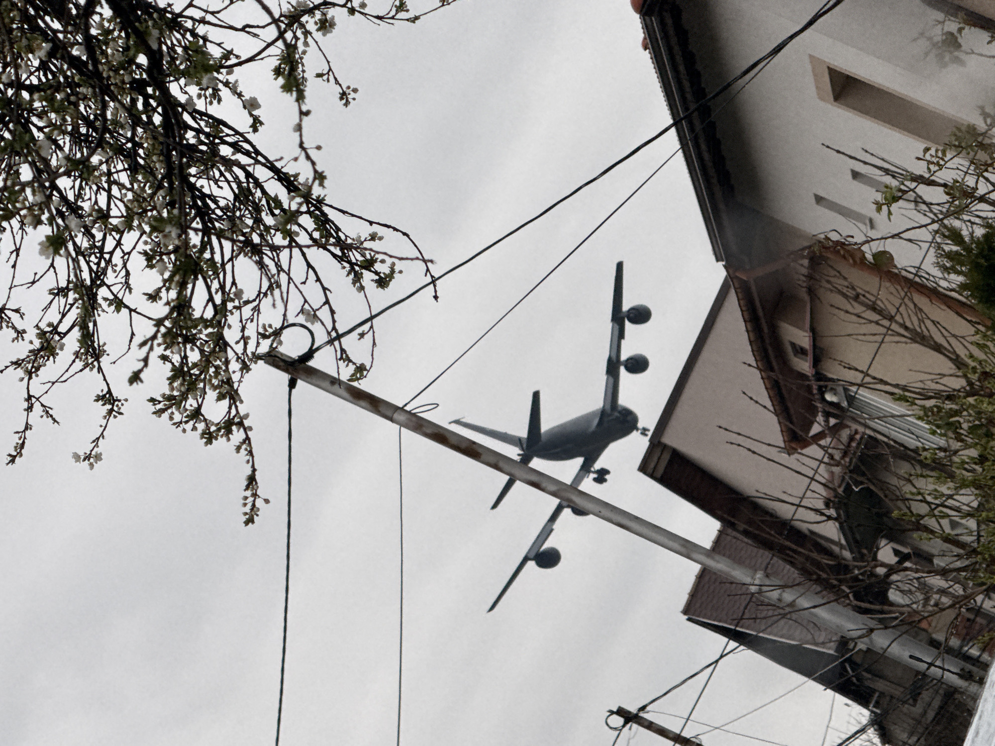 The image depicts a low-angle view in a residential area, potentially in Sofia, Bulgaria. An aircraft is seen flying overhead. Foreground elements include blooming tree branches, power lines, and utility poles. Part of a building with windows is visible on the right side of the frame. The sky is overcast.