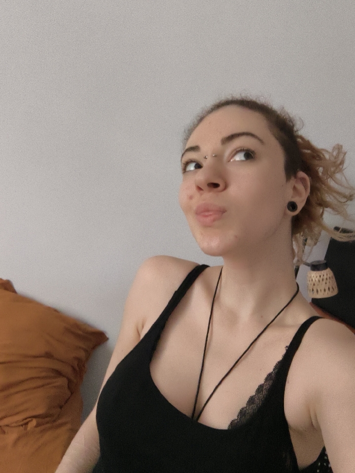 The image displays a female individual situated indoors in La Madeleine, France. The subject, positioned centrally and to the right, has fair skin, light-colored eyes, and light brown hair styled with some strands visible around her head. A bridge piercing with two silver studs is present on her nose. Her left earlobe (viewer's right) features a black circular ear gauge. Her lips are pursed and slightly puckered, with her tongue partially visible. Her gaze is directed upwards and towards the right of the frame. She is attired in a black tank top with thin straps. A black lace bra is visible beneath the tank top on her right side (viewer's left). A thin black cord necklace hangs around her neck, extending over her chest. The background consists predominantly of a light gray wall. To the lower left, a portion of a large orange or brown object, resembling a pillow or folded textile, is visible. To the upper right, behind the subject's right shoulder, a light-colored decorative object with a woven or patterned shade is partially visible.