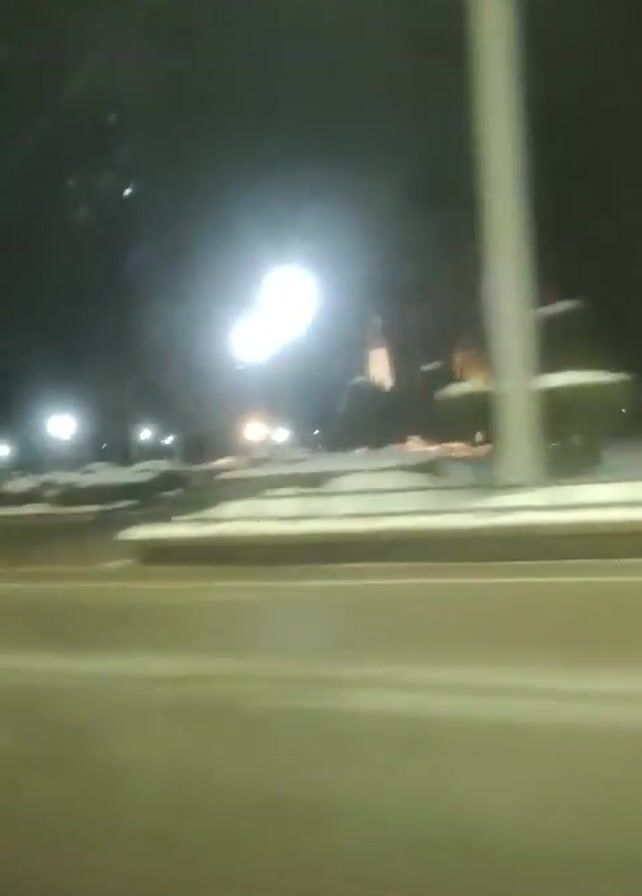 A blurry video appears to be shot from a moving vehicle at night. On the right, a snow-covered area with lights is visible. There's a road with lines running across the bottom of the frame. There are no identifiable people or interactions. The environment is dark and appears to be cold due to the presence of snow.