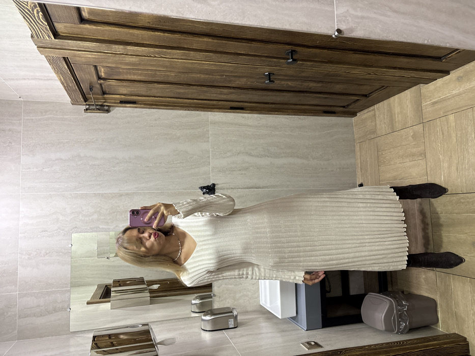The image depicts a female individual taking a mirror selfie in what appears to be a public restroom, located in the city of Ust-Ilimsk, Russia. The room's walls are covered with light-toned, possibly beige or light grey, marbled tiles. The floor is tiled with light brown, wood-grain pattern tiles. A rectangular mirror is mounted on the left wall, reflecting the subject and parts of the room. Below the mirror, a white rectangular basin sink is installed on a dark grey vanity unit. To the left of the sink, two wall-mounted dispensers are visible, one reflective, possibly for paper towels, and another darker unit, likely a soap dispenser. A dark grey trash can with a swinging lid rests on the floor beside the vanity. On the right side of the frame, a dark brown wooden door with multiple panels, decorative top trim, visible hinges, and two black handles is present. The subject is a blonde female, positioned centrally, holding a purple smartphone in her right hand to capture the selfie. Her head is slightly tilted, her eyes are closed or squinted, and her lips are pursed. She is attired in an off-white or cream-colored, V-neck, long-sleeved, ribbed knit midi-dress, accessorized with a light-colored necklace. She is wearing dark brown or black pointed-toe boots with heels.
