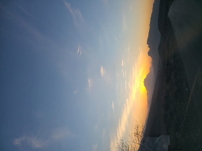 A landscape view shows a mountain range at sunset. The sun casts a bright orange glow between the peaks, fading into a light blue and white sky dotted with clouds. The foreground is dark, possibly with vegetation. A few bare branches are visible at the bottom of the frame. The image is vertically oriented.