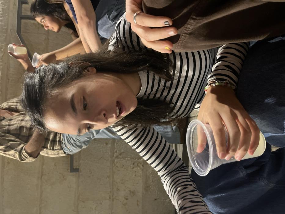 The image depicts a nighttime outdoor social gathering in Modiin-Maccabim-Reut, Israel. The specific location within the city is not visually identifiable. In the foreground, a young individual with long dark hair, wearing a black and white horizontal striped long-sleeve shirt and blue jeans, is seated. This individual holds a clear plastic cup containing a light-colored liquid in their right hand. A silver ring is worn on the ring finger of their left hand, and their left fingernails display varied polish: yellow on the pinky, black on the ring finger, and a plain or clear finish on the middle finger. Multiple colorful beaded bracelets are present on their right wrist, and a small pendant necklace is visible. Their gaze is directed downwards and slightly to the right, with their mouth slightly open, suggesting speech or active listening. Behind and to the left, a partially obscured individual with a beard and wearing a tan-toned plaid shirt and light blue jeans stands or leans against a stone wall, holding a clear plastic cup with a light-colored liquid. To the right, another individual with dark hair is seated, looking upwards and to the right, also holding a clear plastic cup with a light-colored liquid. The background consists of a textured, light-colored stone or concrete wall, upon which a dark metal fixture, resembling a handrail or bracket, is mounted. The scene is illuminated by artificial lighting.