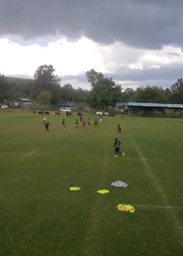 group of people playing a game on a green field under a cloudy sky. The field is marked with white lines and has several yellow and grey objects lying on the ground. Trees and buildings are visible in the background. The people are running and interacting, and appear to be engaged in some kind of sport.