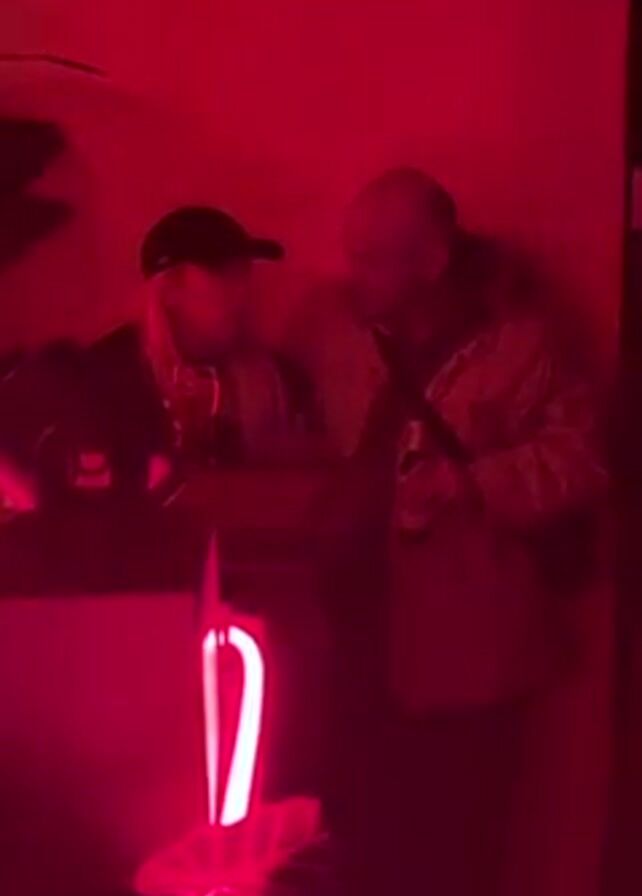 Two individuals, one wearing a cap, stand next to a DJ setup with red neon lighting