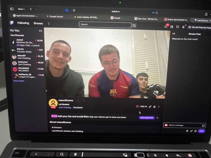 A MacBook Pro laptop displays a live Twitch stream originating from Krems an der Donau, Austria, as indicated by the channel name "manofkrems." The stream's video feed shows three young adult males in an indoor setting with light-colored walls. The individual on the left has short dark hair, a light mustache, and is smiling while wearing a dark hooded sweatshirt. The central individual wears glasses, a red and blue FC Barcelona football jersey, and is also smiling. The third individual, partially visible on the right, has dark hair, wears a black and white striped athletic shirt, and holds an object resembling a pipe or vape pen. The Twitch interface indicates the stream is titled "Laf Moabet," categorized as "Just Chatting," and tagged with "Български" (Bulgarian). It shows a current duration of 0:02:18 and 0 viewers. The channel "manofkrems" has 0 followers. A "Stream Chat" panel on the right displays "Welcome to the chat room!" The left sidebar lists various "Live Channels" with viewer counts. The browser's tab bar includes open tabs for "Work," "Agent Orchestration," "Google Gemini," "Color Palette: #F7F6E...", "twitch.tv," "Claude," "New chat - GitHub Co...", and "Online Sportwetten in...". The bottom portion of the laptop, including the keyboard and trackpad, is visible.
