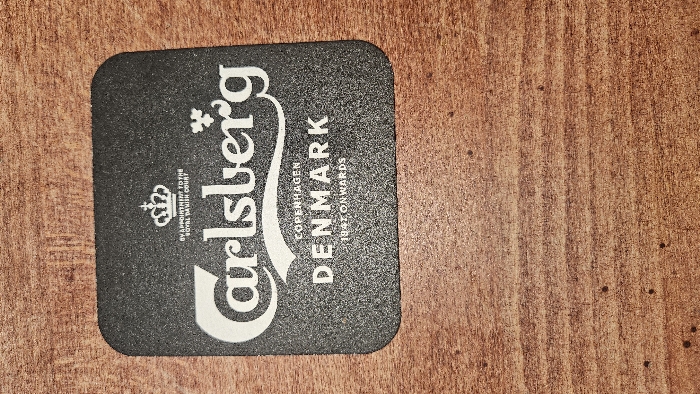 A black square coaster with rounded corners rests on a textured wooden surface. The coaster displays the "Carlsberg" logo in white, vertically oriented and prominent. Below the logo, the text "COPENHAGEN" and "DENMARK" are stacked. "1847 ONWARDS" is aligned beneath "DENMARK." A crown and the phrase "BY APPOINTMENT TO THE ROYAL DANISH COURT" are subtly positioned to the left of the logo.