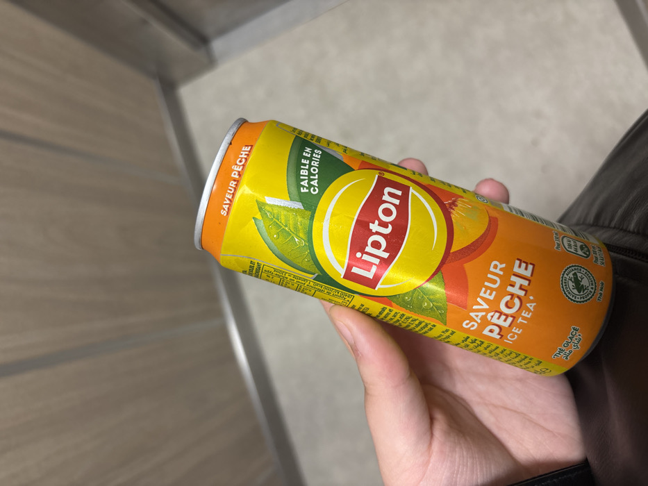 - "A left human hand, with fair skin, holds an upright Lipton brand beverage can, "SAVEUR PÊCHE ICE TEA" (Peach flavor ice tea), in an indoor setting within Strasbourg, France" by FM-upLAF3, licensed under CC BY 4.0