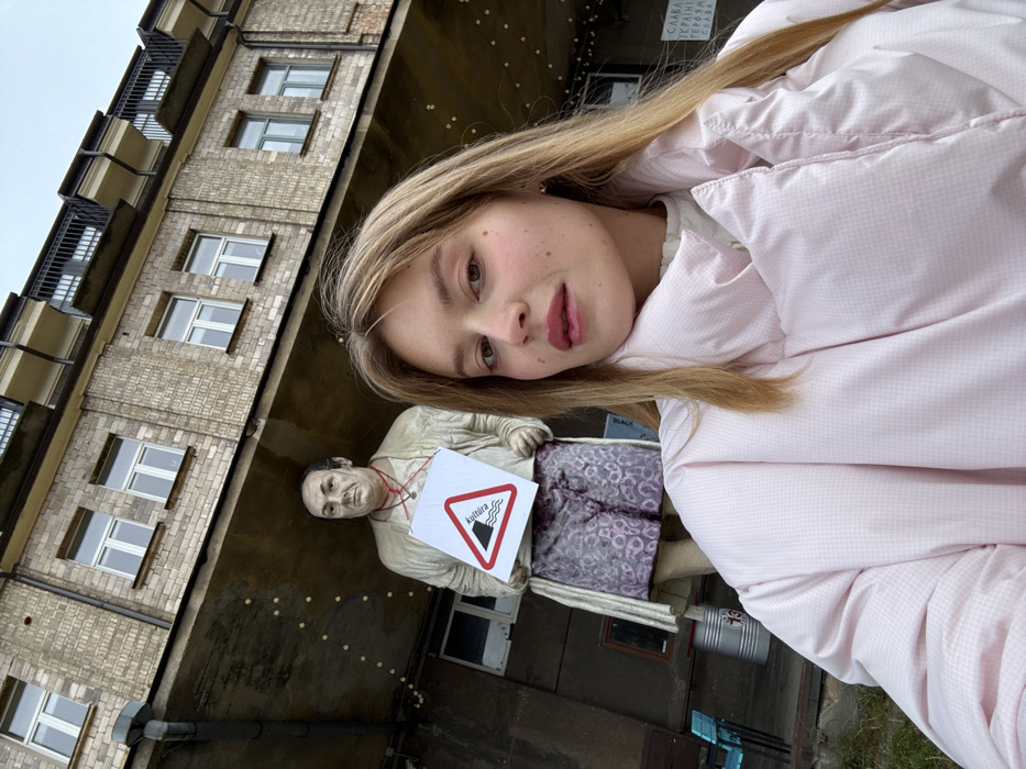 A young adult female is captured in a selfie in front of the Frank Zappa statue in Užupis, Vilnius, Lithuania. The female, positioned in the foreground right, has shoulder-length blonde hair, light skin, and pink lipstick, and wears a light pink quilted puffer jacket over a white top. She looks directly at the camera. In the mid-ground left, the light-colored, full-body statue of Frank Zappa stands, depicted with a stern expression, short dark hair, a light robe, and patterned purple and white shorts. A red cord with a pendant hangs around the statue's neck. The statue holds a white square sign featuring a red triangular warning symbol that contains a black silhouette of a person falling into water and the word "kultūra" (culture). The background consists of a multi-story building constructed of light brown brick, featuring numerous white-framed windows and dark-railed balconies. Below the building's facade, an overhang is strung with small lights. To the left of the statue, a blue chair and a metal barrel with a "13" logo are visible. To the right of the female, a banner displaying "СЛАВА УКРАЇНІ ГЕРОЯМ СЛАВА" (Glory to Ukraine, Glory to Heroes) is visible. The scene is illuminated by overcast daylight.