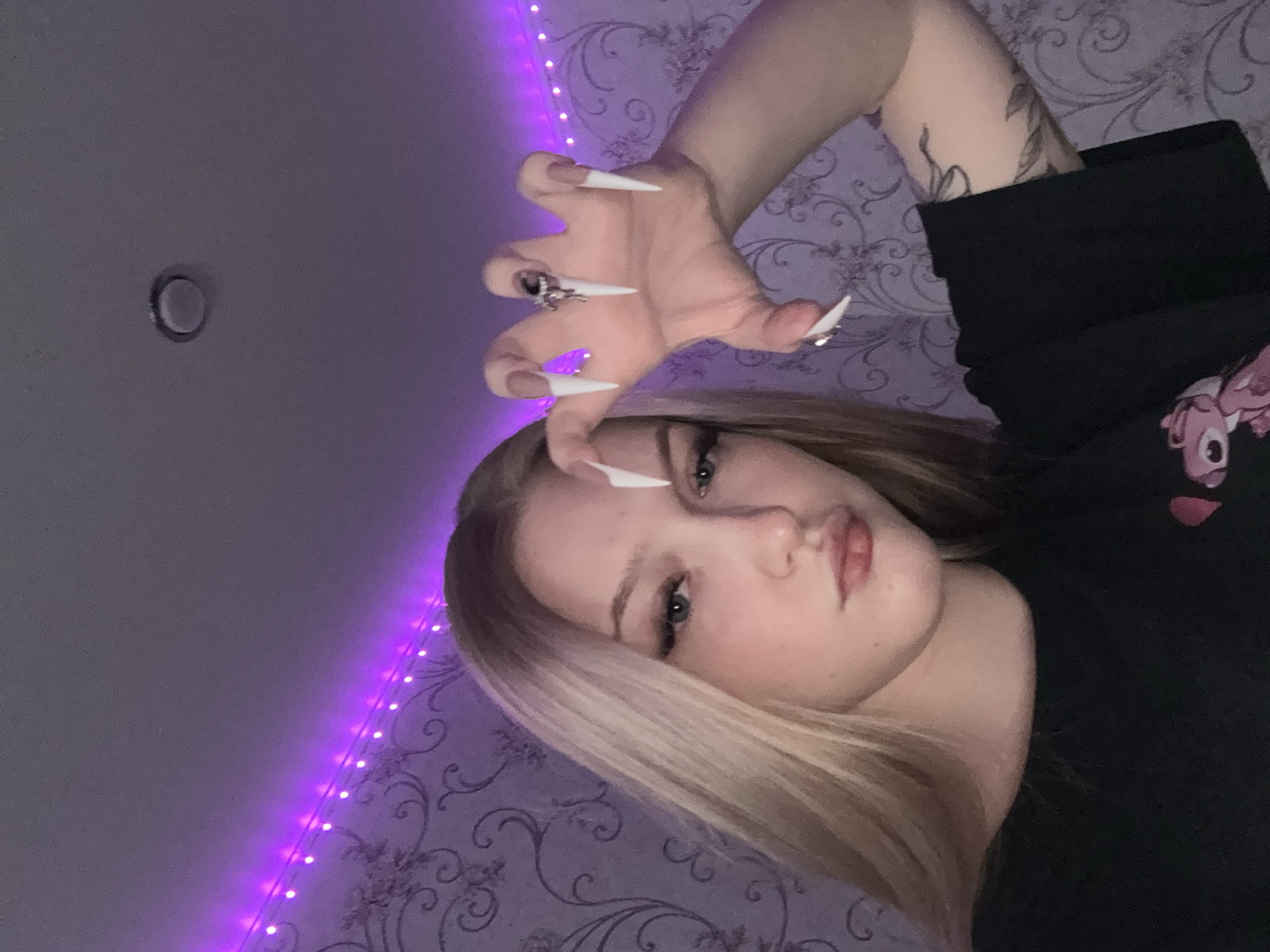 This is an indoor photograph depicting a young female from a head-and-shoulder perspective. The exact location within Saratov, Russia, cannot be determined from the image. The individual has long, straight blonde hair and light-colored eyes, with a neutral expression as she looks directly at the camera. She is wearing a black short-sleeved t-shirt, on which a faint pink graphic, possibly a cartoon character, is visible on the lower right. Her left hand is raised and extended towards the camera, fingers splayed and curved into a claw-like gesture. Her fingernails are long, sharply pointed (stiletto-shaped), and white. She wears at least two rings on her left hand: one on her ring finger, which appears to be dark and intricately designed, and a second, smaller ring on her pinky finger. A tattoo consisting of dark line art depicting leaves or vines is visible on her left upper arm. The background features a wall covered in light-colored wallpaper with a repeating floral or scroll pattern. Along the upper edge of the wall, a string of purple LED lights is illuminated, casting a distinct purple ambient light. A single, round, recessed light fixture is visible on the light-colored ceiling above.