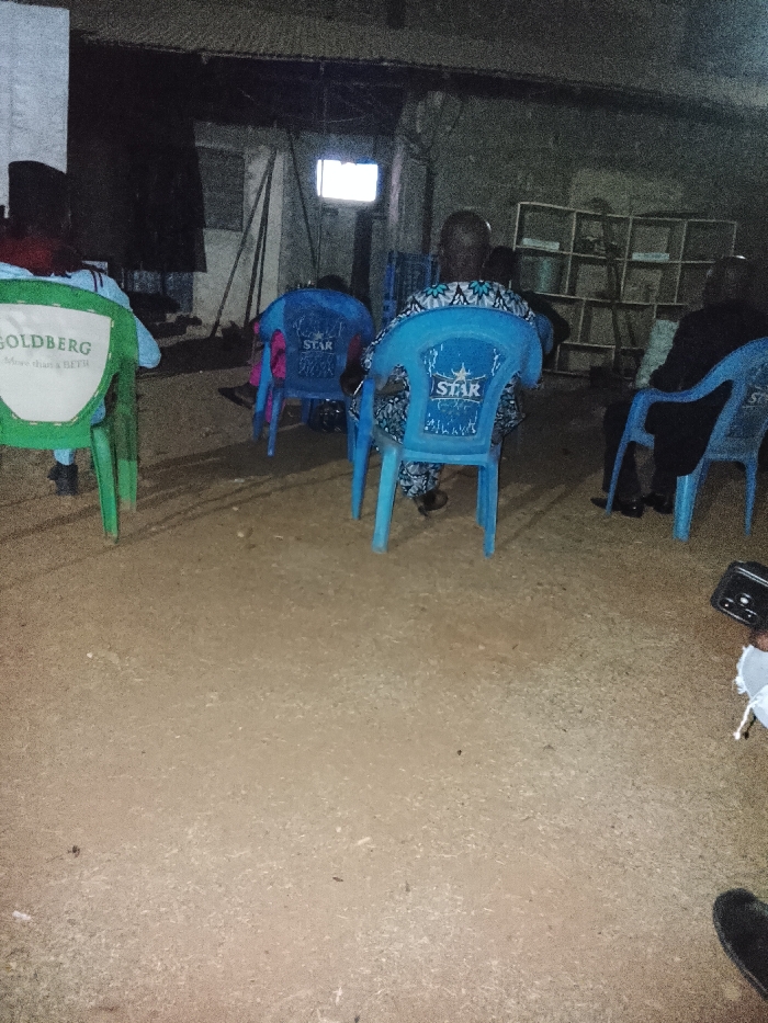 A group of people sit on plastic chairs in an outdoor setting, likely watching a screen positioned in front of them. The scene is dimly lit, possibly at night. The chairs are branded with beer names such as "Goldberg" and "Star." A shelving unit is visible against a wall in the background. The ground is dirt.