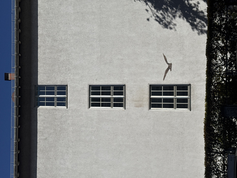 The image displays the light gray, textured stucco facade of an unspecified building in Munich, Germany, under a clear blue sky. Three identical rectangular windows, each with a white frame and dark panes, are vertically aligned on the right side of the facade. Above, a silver-colored rain gutter and a white metal railing run along the roofline, with a reddish-brown brick chimney visible against the sky. A brownish-gray bird is captured in mid-flight, wings outstretched, positioned on the right side of the facade, between the middle and lower windows. Strong sunlight from the left casts a distinct shadow from the roof overhang onto the upper facade and a patterned shadow of tree foliage onto the right side of the wall. A dense, dark green hedge extends horizontally across the bottom of the frame. No individuals are present in the scene.