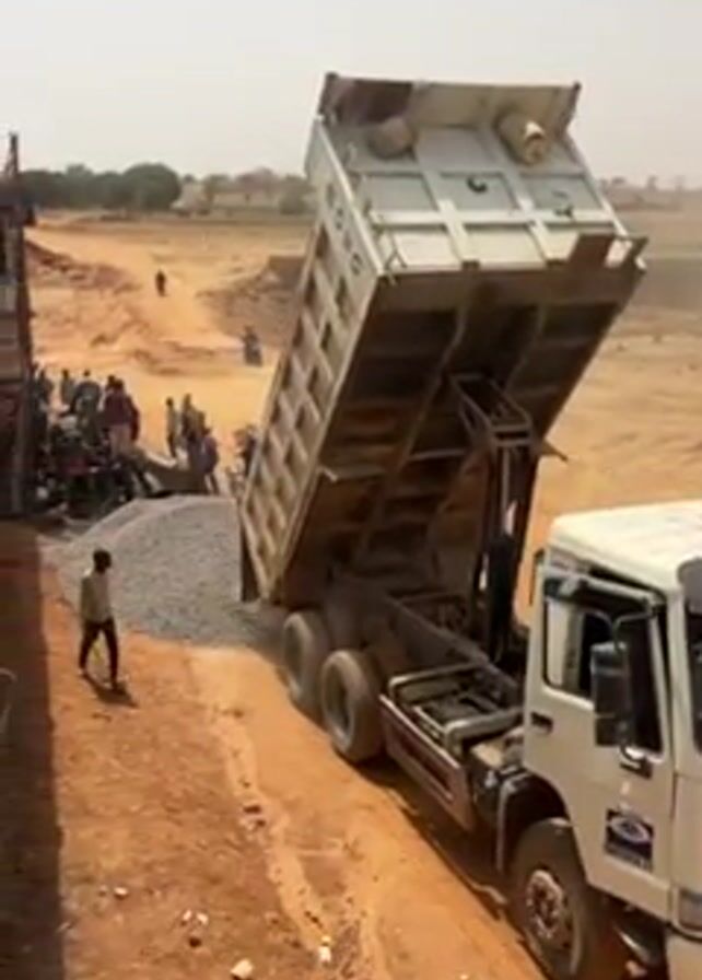 . The video shows construction work, most likely on a bridge or overpass. A dump truck unloads gravel onto a dirt road. People stand around, possibly overseeing or assisting. A man walks by. The camera pans to show workers spreading fresh concrete over a metal rebar grid on a raised platform. In the background is a rural landscape with trees and fields.