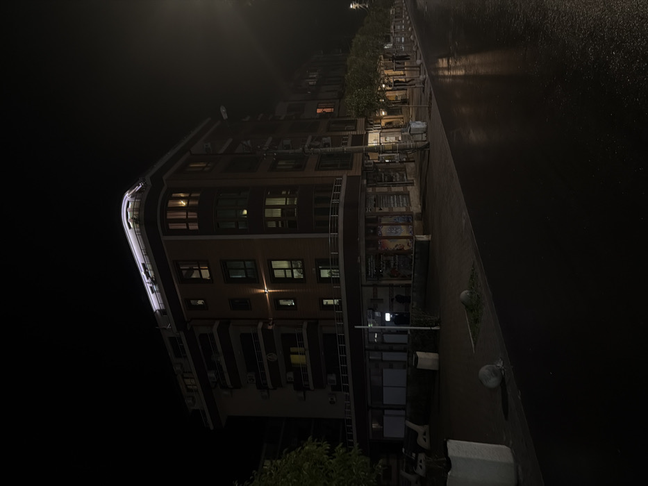 The image displays a nighttime street scene in Burgas, Bulgaria. A multi-story, dark-colored building, possibly brick, occupies the central left, featuring numerous windows, some internally illuminated with warm light, and balconies across several levels. The building's corner is rounded, with a continuous, brightly illuminated white strip lining its rooftop edge. On the ground floor, commercial spaces are visible through large display windows. Near what appears to be an ATM, two indistinct human figures are standing. The asphalt street in the foreground and extending to the right is wet and highly reflective, mirroring ambient light sources. The adjacent sidewalk, also appearing damp, is lined with several pruned trees, streetlights, benches, concrete planters, and spherical bollards. Further down the street on the right, additional indistinct human figures are visible. The overall environment is dark, illuminated by artificial light sources from the building, streetlights, and reflections on wet surfaces.