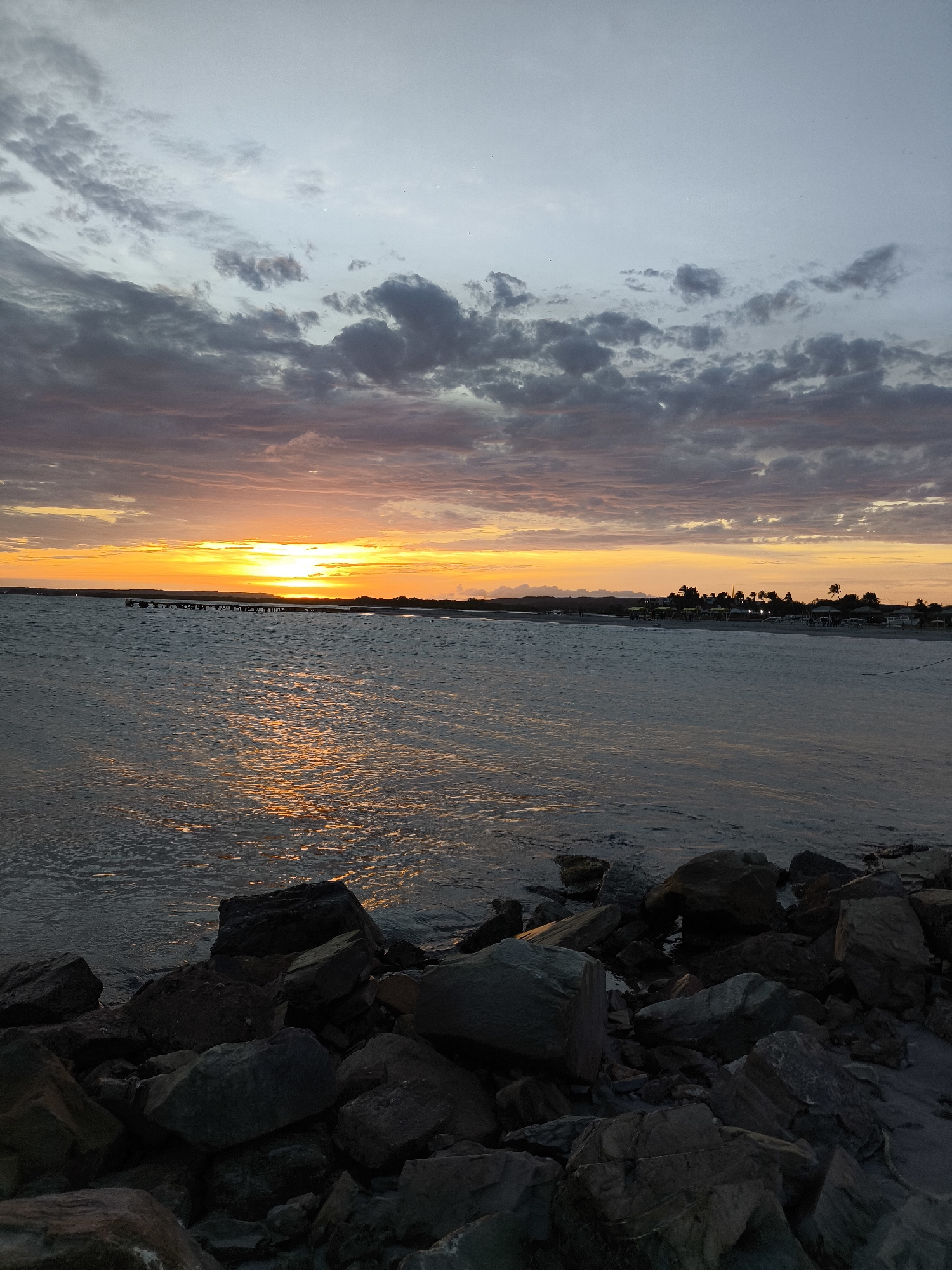 The image captures a sunset scene at El Yaque, Venezuela. In the foreground, there are numerous dark, medium-sized rocks piled together, forming a barrier or breakwater. Beyond the rocks is the ocean, reflecting the orange and yellow hues of the setting sun. A faint pier or structure extends into the water towards the left of the horizon. On the distant shoreline, palm trees and building silhouettes are visible. Above, the sky is filled with a mix of dark, gray clouds and the vibrant colors of the sunset, transitioning to lighter grays and blues higher up.