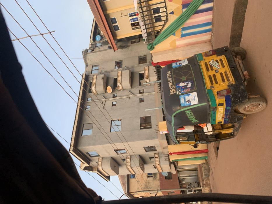 A three-wheeled vehicle, black and yellow, with political posters affixed to its rear, stands on a street. A multi-story gray building with symmetrical balconies is in the background. Above that is a lighter-colored building. Power lines intersect the sky. The image appears to be taken from inside another vehicle. The ground is a reddish-brown color.