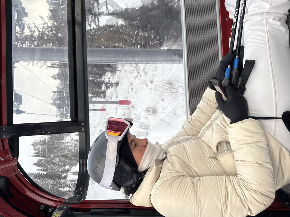 - "A person wearing a ski helmet, goggles, and a white jacket sits in a ski lift, looking out the window at a snowy landscape with trees" by FM-BS4Ql2, licensed under CC BY 4.0