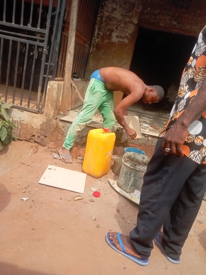 The scene is an outdoor construction or renovation area within the city of Nnobi, Nigeria