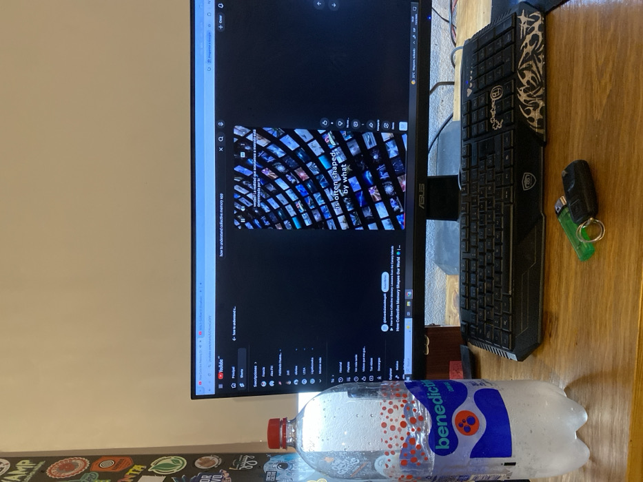A monitor with a YouTube page open displays a video on collective memory apps. The screen shows an Asus logo and part of a keyboard. To the right of the monitor, there's a keyboard with a patterned wrist rest, along with keys and a lighter. A bottle of Benedictino water sits in the foreground, partially obscuring the bottom of the screen. Stickers adorn the bottom left corner of the surface the objects are on.